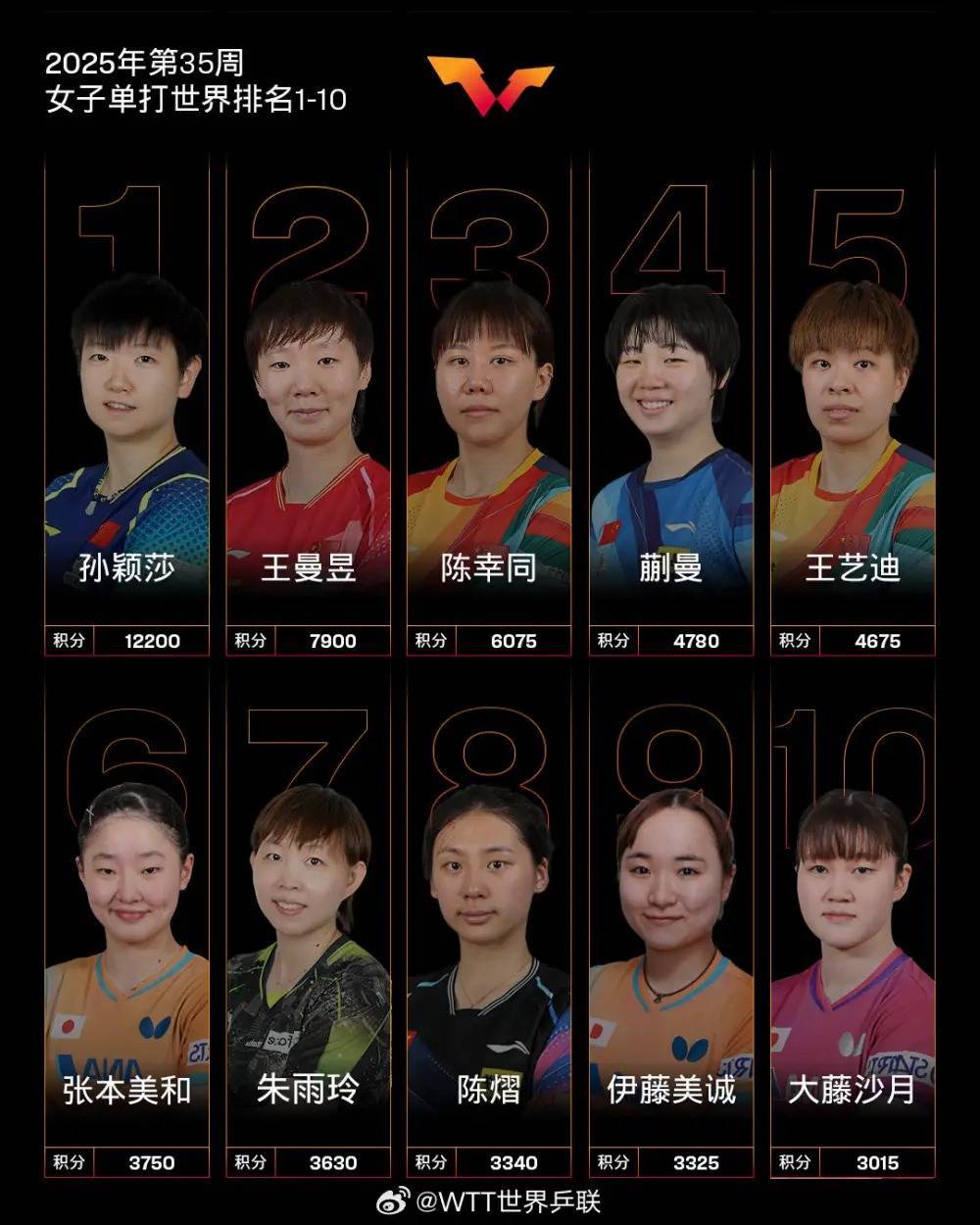 女两边面,瑞典捧杯的孙颖莎/王曼昱升至第3。