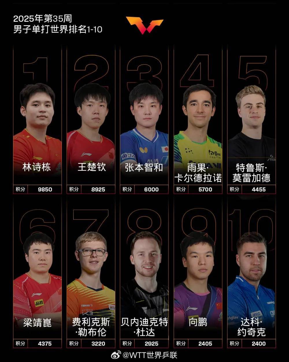 须眉单打,中国队球员林诗栋、王楚钦位列前二,梁靖崑位列第六,向鹏位列第九。