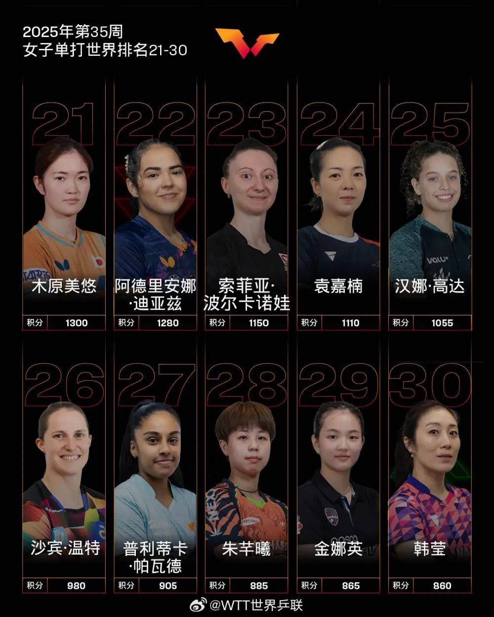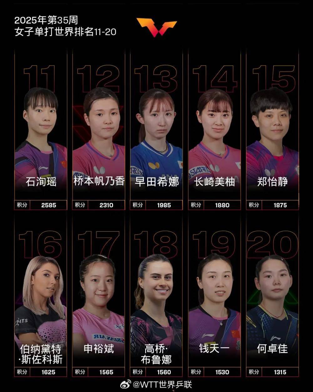 WTT欧洲大满贯瑞典站女单四强陈熠排名高潮2个排名位列第8,刷新个东说念主事业生活新高;女单四强石洵瑶排名高潮1个排名位列第11,刷新个东说念主事业生活排名新高;女单八强沙宾·温特排名高潮14个排名位列第26,刷新个东说念主事业生活排名新高;女单十六强李恩惠高潮11个排名位列第38;女单三十二强安妮特·考夫蔓高潮30个排名位列第69。