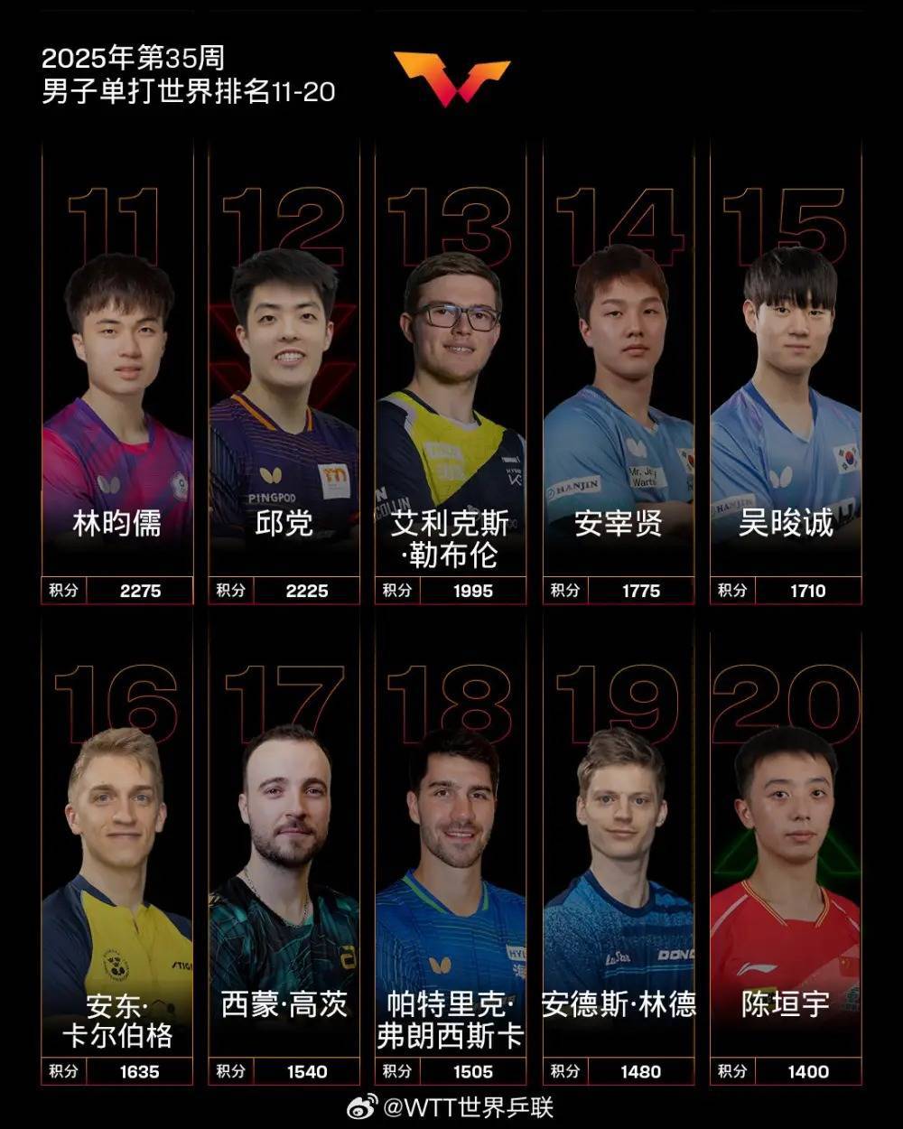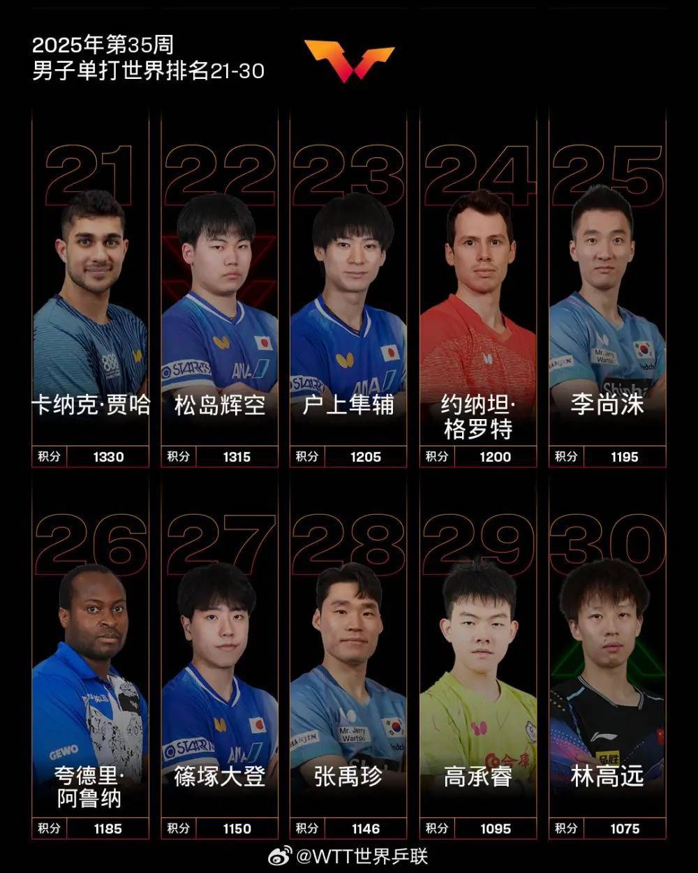 WTT欧洲大满贯瑞典站男单冠军特鲁斯·莫雷加德排名高潮2个排名位列第5;男单四强贝内迪克特·杜达排名高潮2个排名位列第8,刷新个东说念主事业生活新高;男单八强安宰贤排名高潮3个排名位列第14,刷新个东说念主事业生活新高;男单十六强吴晙诚排名高潮1个排名位列第15,刷新个东说念主事业生活新高;男单四强西蒙·高茨排名高潮15个排名位列第17;男单十六强赵大成排名高潮20个排名位列第47;男单十六强阿德里安·拉森福斯排名高潮47个排名位列第56;男单三十二强卢卡·姆拉德诺维奇排名高潮44个排名位列第93。